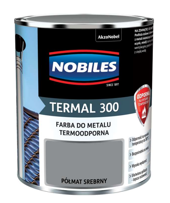 - Nobiles Termal 300 to farba silikonowa przeznaczona do malowania i konserwacji powierzchni stalowych i żeliwnych oraz metali nieżelaznych (aluminium, ocynk, miedź) narażonych na działanie wysokich temperatur do 300°C.