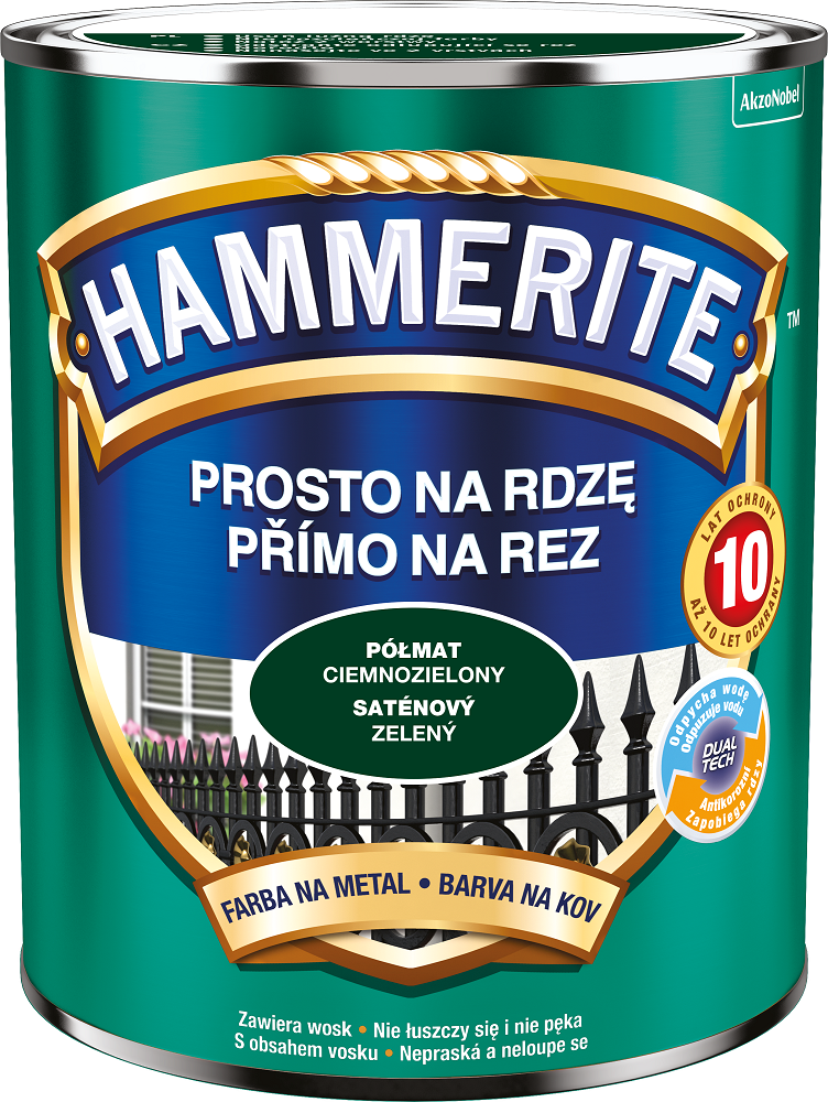 Hammerite PROSTO NA RDZĘ jest jednoskładnikową farbą schnącą na powietrzu, przeznaczoną do antykorozyjnego i dekoracyjnego malowania metali żelaznych (stal, żeliwo). Specjalnie dobrana kombinacja składników nadaje farbie optymalną, wysoką konsystencję, umożliwiając nakładanie grubych warstw. Formuła DUALTECH zapewnia podwójną ochronę malowanym elementom: tworzy barierę chroniącą przed wilgocią i zapobiega powstawaniu rdzy. Dzięki specjalnej recepturze malowanie powierzchni metali żelaznych nie wymaga bardzo dokładnego oczyszczania z rdzy, nakładania warstw gruntujących i podkładowych. Odpowiednia pigmentacja i wyselekcjonowane żywice, będące bazą tego produktu, zapewniają optymalną ochronę przed wpływem warunków atmosferycznych i korozyjnych. Farbę można stosować również wewnątrz pomieszczeń.