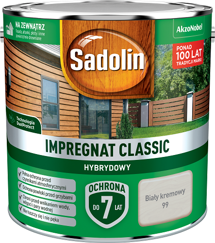 - dla kolorów: piniowy, dąb jasny, drzewo wiśniowe, mahoń, biały kremowy, orzech włoski oraz w przypadku kolorów rozjaśnionych za pomocą Sadolin Impregnat Classic Hybrydowy bezbarwny (dotyczy wszystkich kolorów),